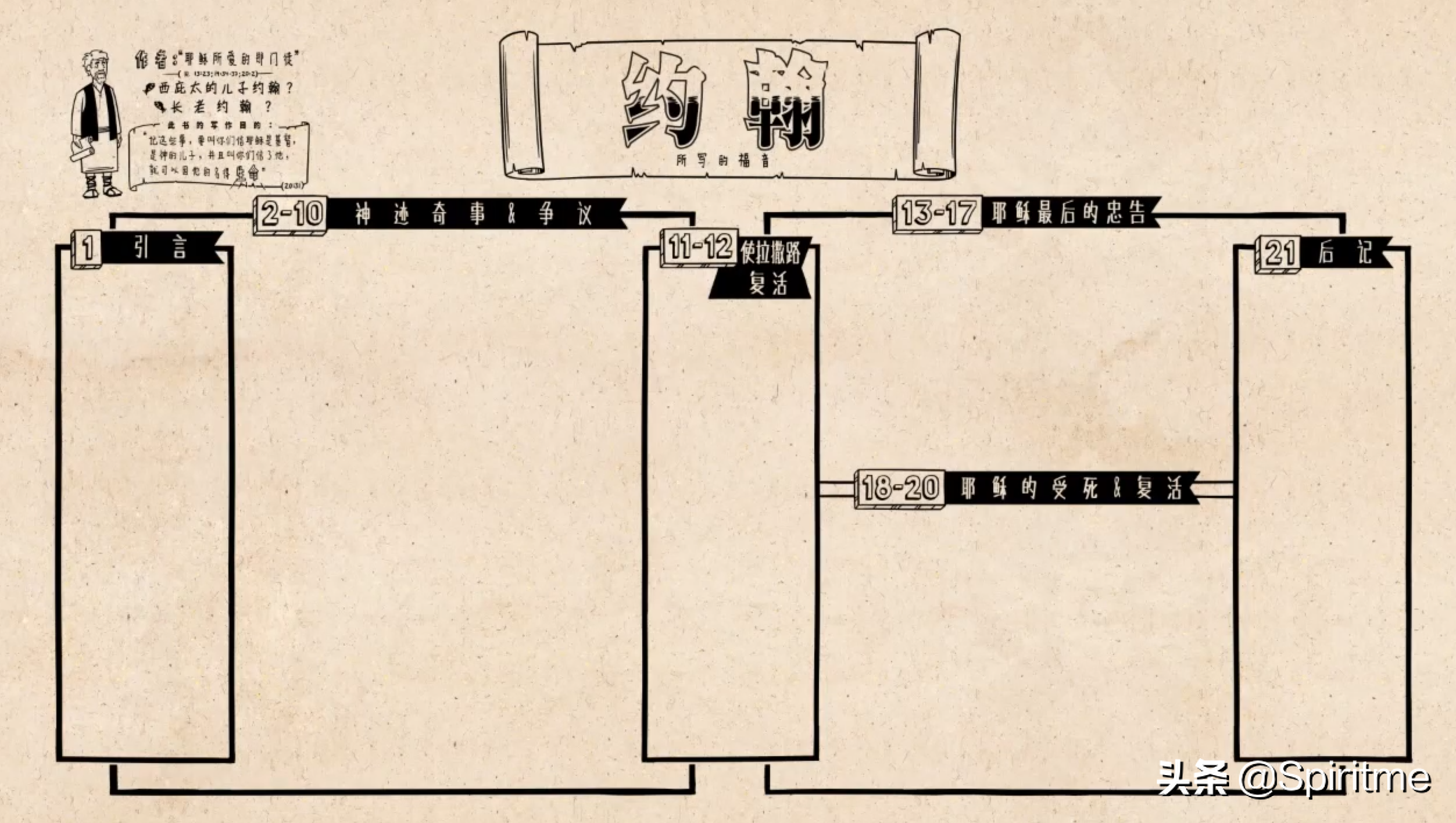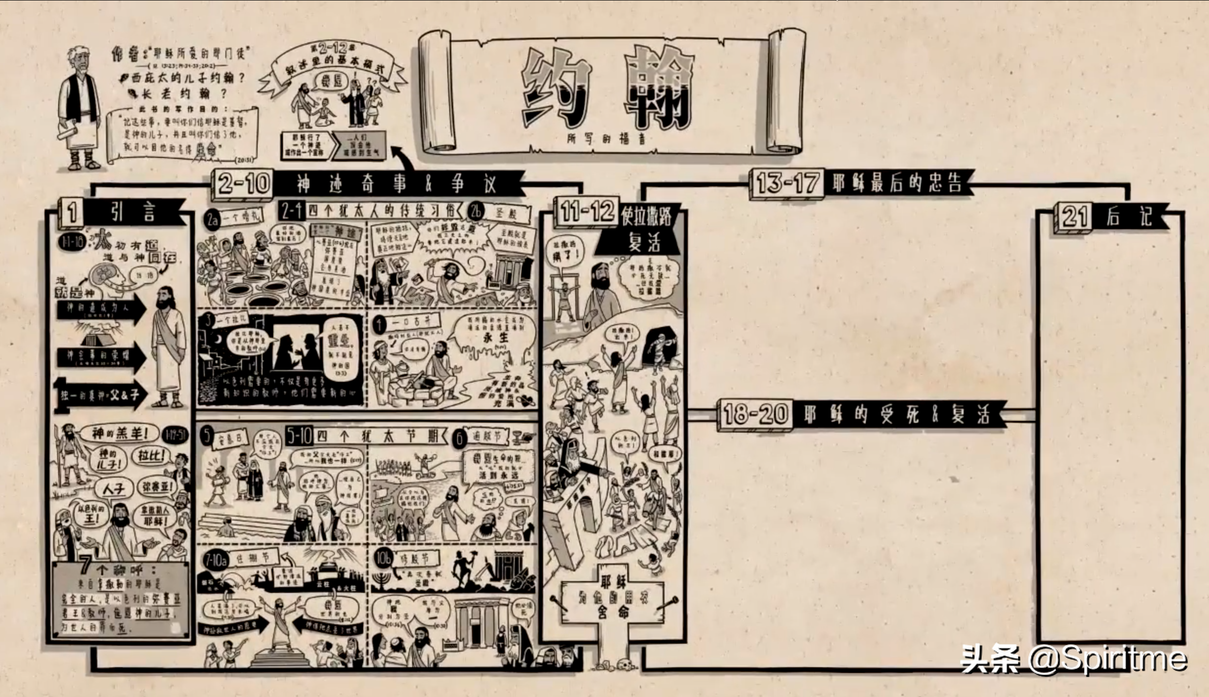 这卷书的整体设计非常好。前半部分以一首诗开头。接着是简短小故事,随后一系列耶稣所行的神迹奇事,而所有的事情都指向耶稣最伟大也最有争议的那场神迹,就是让拉撒路从死里复活。这件事引发了以色列宗教领袖的不满,他们决心杀害耶稣。由此,我们进入《约翰福音》的下半部分。其中讲述了耶稣的最后一夜,以及他留给门徒的忠告,之后他被捕,受审讯,并钉死在十字架上,并且从死里复活。整卷书以一段后记结尾。