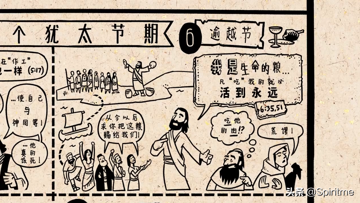 随后的故事发生在逾越节期间,这是一场具有象征意义的盛宴,重复了《出埃及记》中有肉,有饼,有葡萄酒的那顿晚餐。耶稣奇迹般的变出食物供给给几千人,可惜人们只看中他给的食物。然后耶稣宣告说他就是生命的粮,如果人吃他,就能获得永生。但是耶稣的这番话,让很多人接受不了,他们就离开他走了。