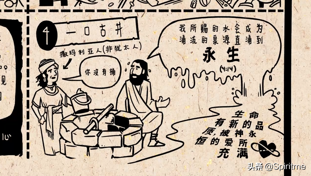 耶稣从这里往北走,在一口神圣的古井旁停了下来,虽然犹太人瞧不起撒玛利亚人。但是他却主动与来井边打水的撒玛利亚女人交流。他们说到水,耶稣就以水为比喻,代表他自己。说他有生命的活水,这水能成为永生的泉源。在《约翰福音》中这意味着生命会有一种新的品质。被神永恒的爱所充满,这永生现在就可以开始并直到永远。