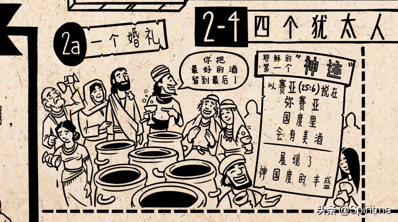 在故事的第一部分,耶稣遇到了四个传统的犹太习俗。而在每个里面,他就是这个习俗所指向的那一位。第一个是在婚礼上,酒喝光了。耶稣就把六大缸约450升的水全部变成上等佳酿。以至于管宴席的还笑话新郎“你把最好的酒留到最后”,可见的确是好酒。约翰把这看做耶稣所行的第一个神迹,换句话说,它是启示耶稣身份的一个象征。正如以赛亚所说,弥赛亚王国度像这场盛宴,提供许多优质的葡萄酒,因此,这第一个神迹显示了耶稣的国度的丰盛。