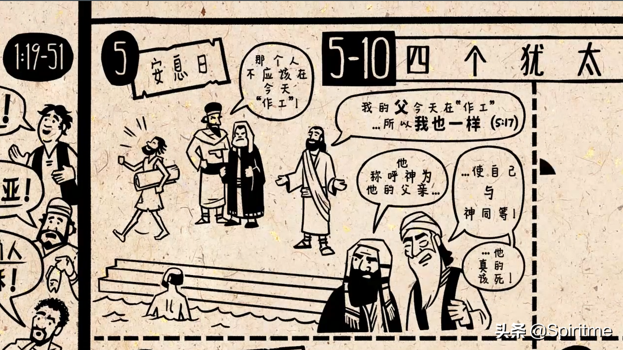 耶稣首先在安息日医治了瘫痪的人,引发了一场辩论与犹太领导人讨论安息日能否工作的争议。耶稣说因为他的天父在安息日做工,因此他也照样做工。他们听到耶稣称呼神为父,让自己与神同等,就想杀他。