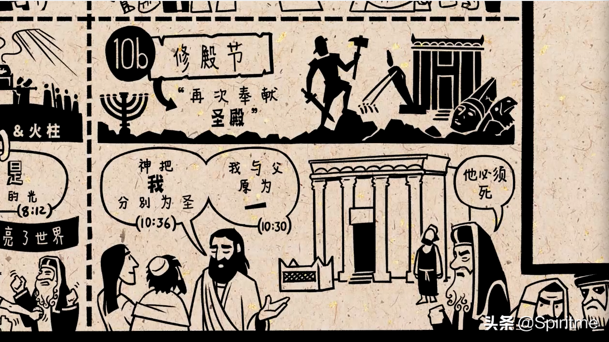 最后一个故事发生在修殿节,意思是再次奉献。修殿节是为了纪念马卡比(makabi)清除了圣殿中的神像,并再次将圣殿分别为圣的历史事件。和耶稣进入神殿的空间,宣称他就是神分别为圣的那一位。他才是神所居住的真正的圣殿,他说,我与父原为一,这些话大大地激怒了耶路撒冷的宗教领袖,他们开始密谋要杀掉耶稣,耶稣就离开了耶路撒冷。