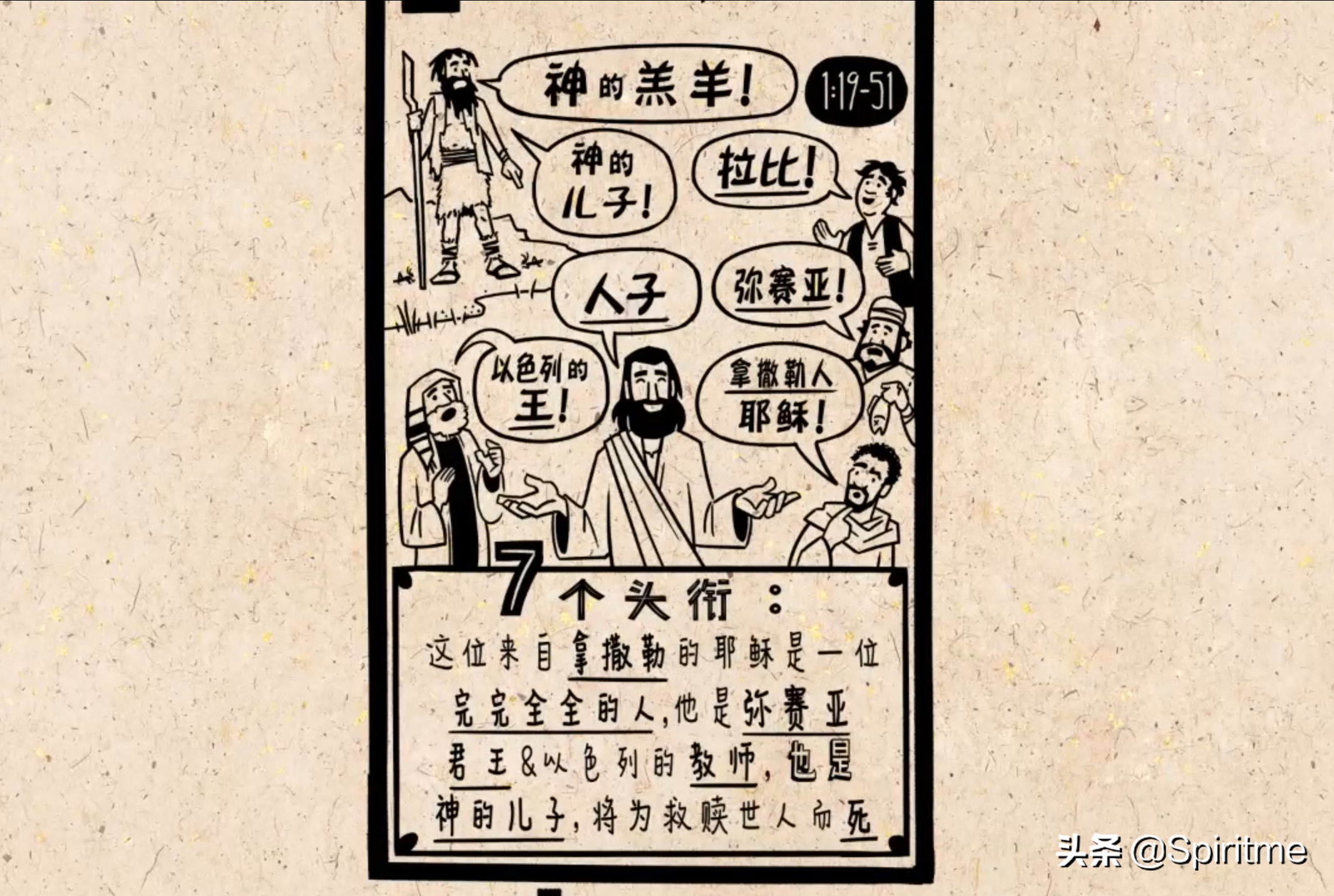 作者却开始讲起,讲施洗约翰遇见耶稣,然后引导别人认识他,并成为他的门徒的故事。这些人接二连三地跑来认识耶稣,就回去告诉别人耶稣是谁。在这一章中,耶稣被赋予了七个头衔。从这卷福音书中可以发现,约翰对数字7情有独钟,这七个头衔归结起来是要说明一件事,这位拿撒勒人耶稣,是完完全全的人,是弥赛亚君王,是以色列的教师,也是神的儿子,他将救赎世人的罪而死。
