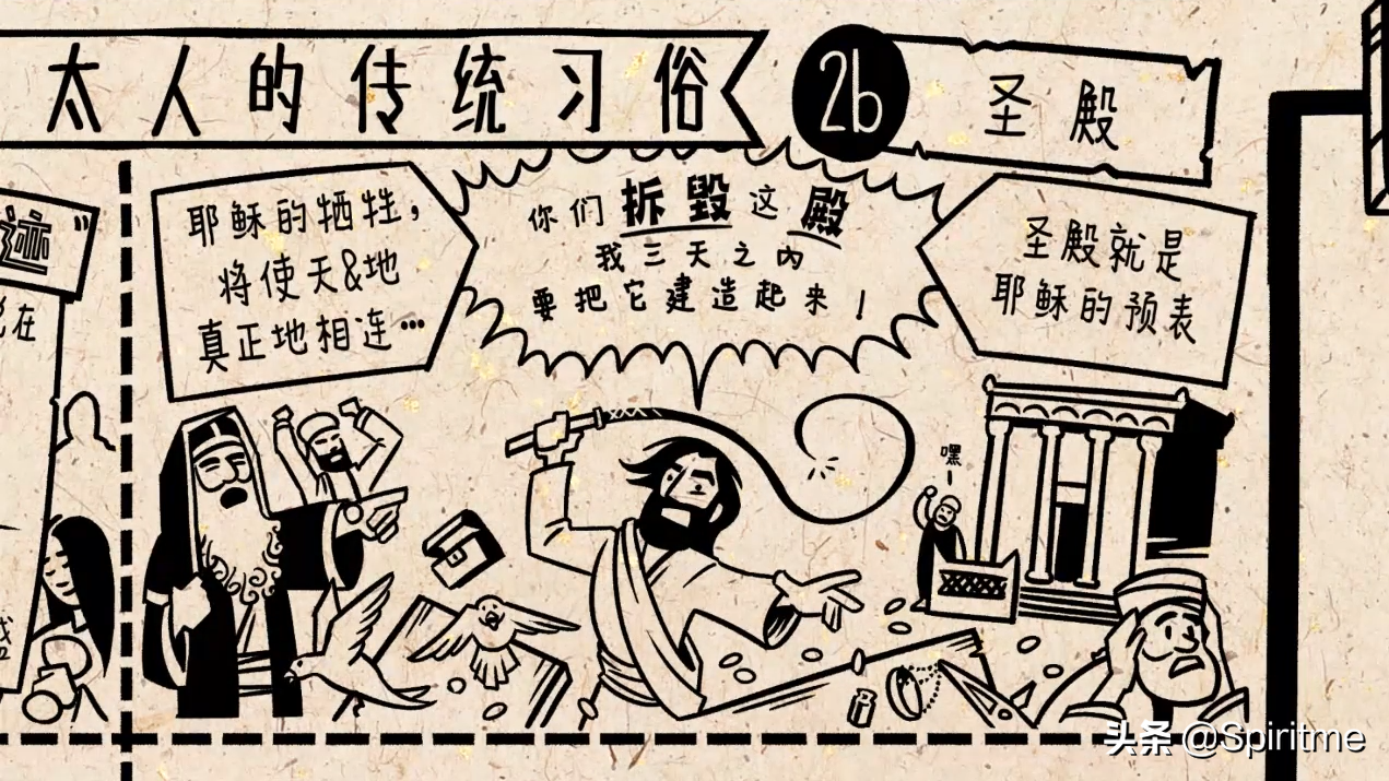 接着耶稣去耶路撒冷的圣殿(这里是天与地合一之处,是神与子民相会的地方)。耶稣宣告说,他的权柄在这之上,他赶出圣殿中兑换钱币的犹太人,禁止祭祀;管理圣殿的领袖因此指责他,耶稣说:“你们摧毁这殿,我三天之内,要把它建造起来。”耶稣说他的牺牲就是献祭,将使天与地真正的相连。神殿预表了他将被杀害的身体。
