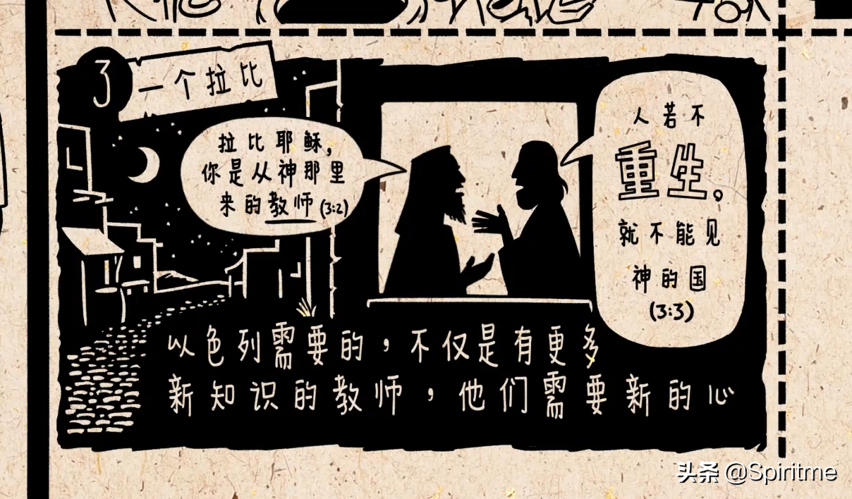 随后耶稣与犹太人的教师尼哥底母交谈了一整夜,尼哥底母以为耶稣跟他一样,也是教师。但是耶稣说以色列需要的不仅是有更多新知识的教师,以色列需要新的心和新的生命,耶稣说“人若不重生,就不能见神的国。”耶稣知道人类被自己的罪和私欲捆绑最后的结果就是死路一条。但他也知道神热爱世人,所以他来为人们重生,给人们提供了新的机会重新开始。