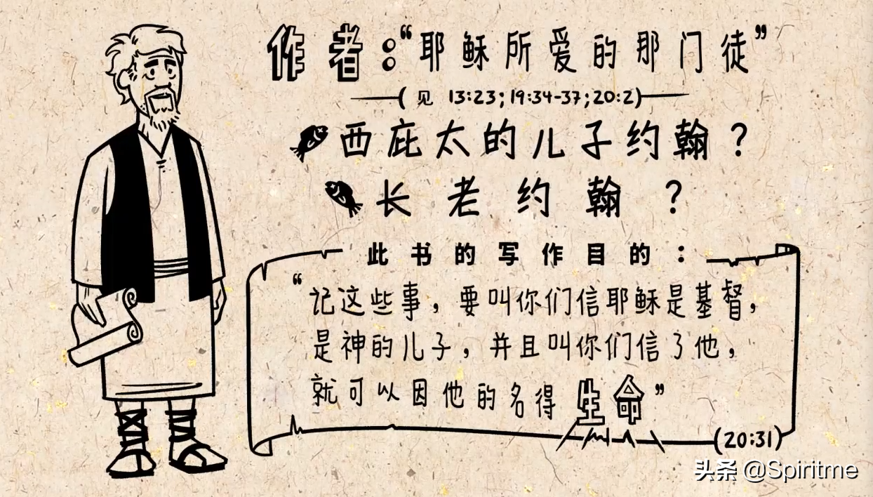 在这卷书的结尾指出,作者是耶稣最亲密的跟随者之一,就是书中那位“耶稣所爱的门徒”。作者本人在书中也曾多次出现,但这究竟是哪一位约翰,后来也有不少争议,是十二个门徒中西庇太的儿子约翰?还是另一位住在耶路撒冷,被称为长老约翰呢?不管哪一位,《约翰福音》都是作者亲眼所见,并且精心编排的内容。写作的目的,就如约翰在结尾处所说:“记这些事,要叫你们,信耶稣是基督,是神的儿子,并且叫你们信了他,就可以因他的名得生命。” 20章31节
