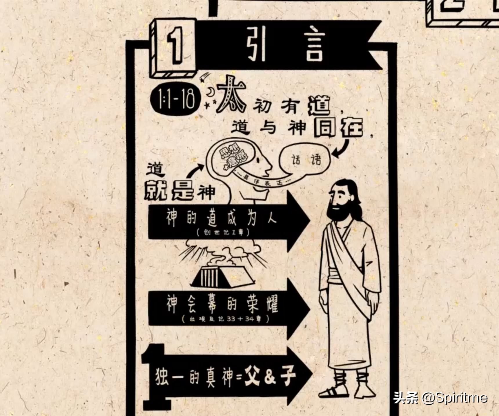 那个盘旋在约柜之上荣耀又神圣的灵,变成了耶稣这个人。由此,作者引出了最后一个宣告,以色列敬拜的独一真神包含圣父和圣子,圣子耶稣成为人是为了将圣父显给我们看。这段表达读起来相当烧脑,很难立刻明白。