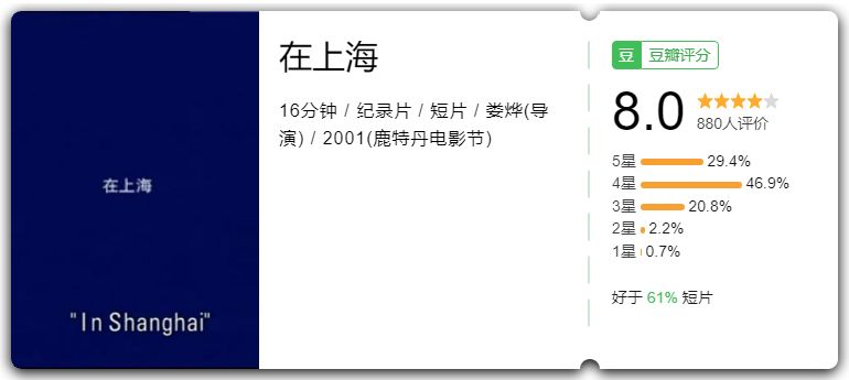 回答一下吧,能,而且不俗。今天给大家推荐的电影就是一部纪录片,就是一部娄烨导演拍摄的纪录片。影片叫做《在上海》。这是娄烨导演早年间的一部作品,这是一部你即使不去看影片工作者名单,也能认出这是一部娄烨导演作品。为什么这么说,因为很多看到这里的熟悉娄烨导演的朋友们就会明白,我一定再说那个。哪个?当然是那个,当然是“手持+摇摆”。