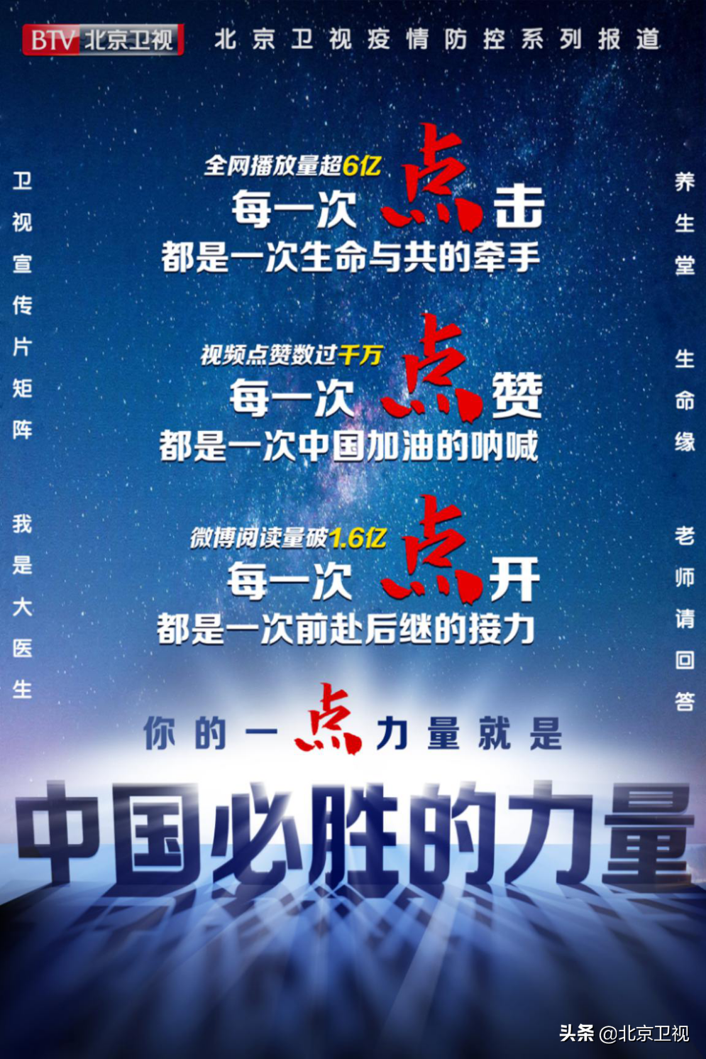 截至目前,北京卫视《养生堂——疫情防控特别节目》收视多次位列省级卫视前三,《生命缘》疫情防控特别报道收视多次位列省级卫视第一,长短视频全网点击量超6亿,视频点赞数过千万,微博阅读量破1.6亿,成绩之下,是北京卫视战“疫”必胜的信念。