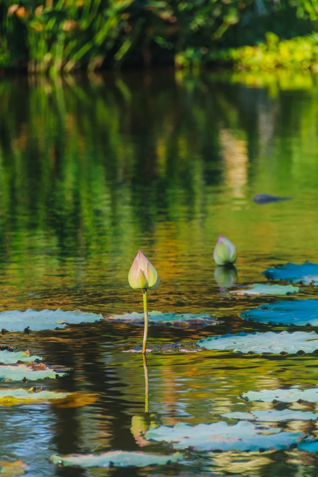 湖面还汇聚了许多圆圆的小绿盘