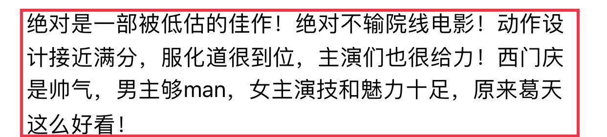 绝对是一部被低估的佳作!绝对不输院线电影!动作设计接近满分,服化道很到位,主演们也很给力!西门庆是帅气,男主够man,女主和演技魅力十足,原来葛天这么好看!