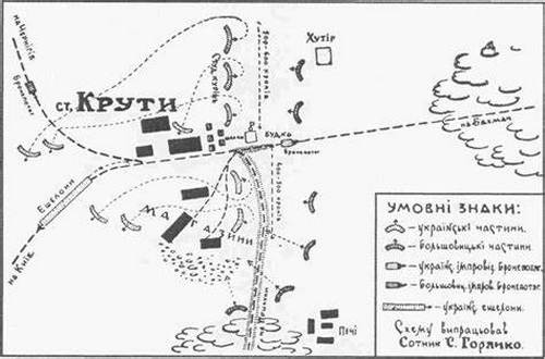 从巴赫马奇出发的铁路线到基辅只有200多公里,一路上无险可守,只有上尉阿哈皮·本查伦科(ahapiy honcharenko)指挥的一支匆忙拼凑起的小部队驻守在铁路必经的克鲁特(kruty)火车站上,这支部队由基钦茨基军校的300名军校学员和一个100余人的自由哥萨克连队组成。这支部队原本驻扎在巴赫马奇,当他们被驱逐到克鲁特时仅剩300余人。