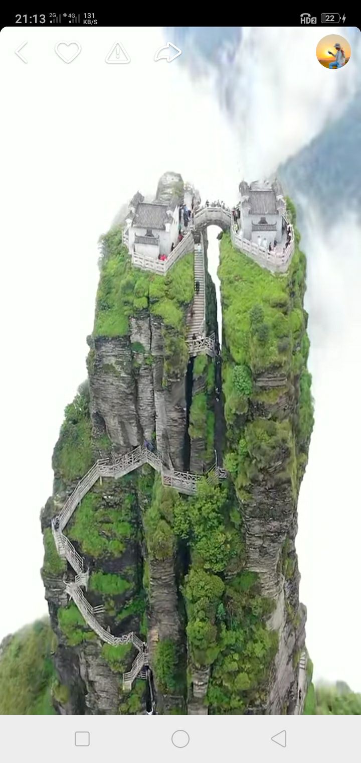 鬼斧神工梵净山,四海闻名有奇观。同根生出两柱峰,齐头并肩入云端。更叹山上两寺院,巧夺天工一桥牵。游人不敢高声语,恐惊天上众仙班。此景只有天上有,原来仙境在人间。