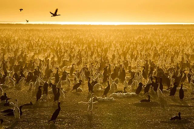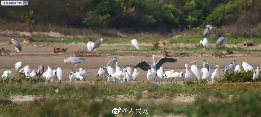 广东阳江海陵大堤湿地,位列全球第二濒危水鸟的黑脸琵鹭,成群结队地出现。
