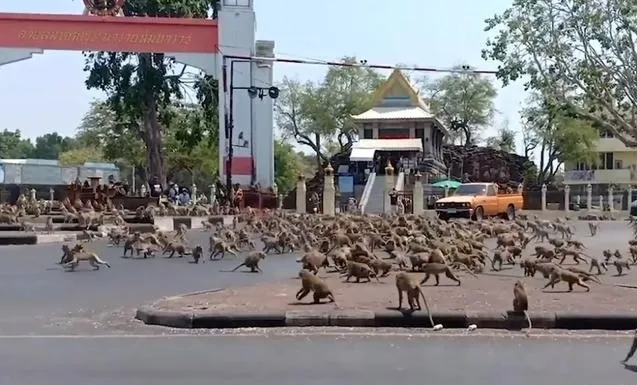 泰国中部,数百只猴子冲上大街,为了抢夺香蕉而“大打出手”。