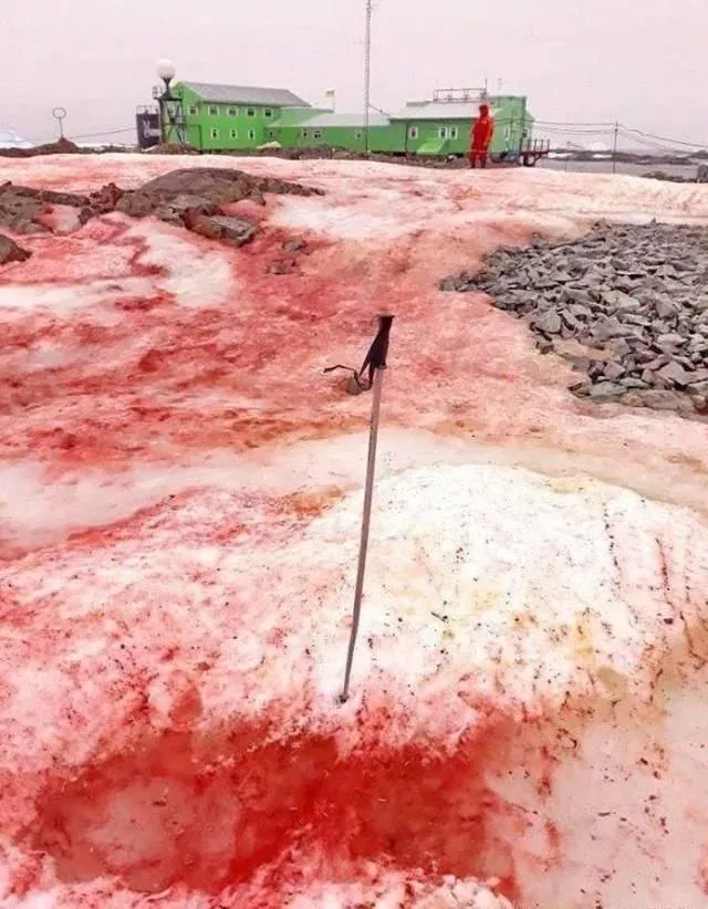 在全球变暖的作用下,南极藻类大量繁殖,雪层变成了血红色。
