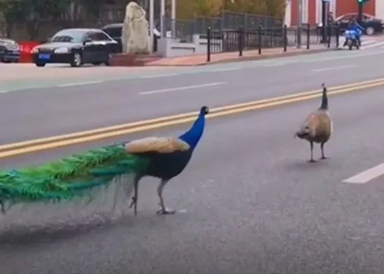 山东济南,不知从何而来的孔雀走上了街头,空荡荡的街道成了它们的“秀场”。