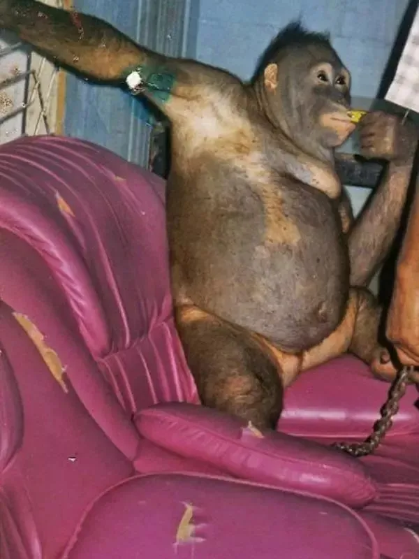 当“红毛猩猩生存基金会”的志愿者发现她时,这个可怜的猩猩已经被彻底驯化,一有人走近就会转身熟练地翘起屁股。