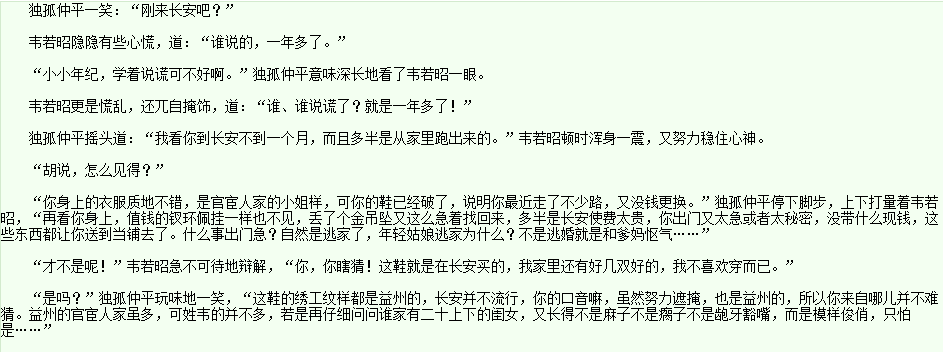 比如小说中男主独孤仲平推断女主“韦若昭”的身世背景时,只是通过对话表达信息,并没有多余描写。