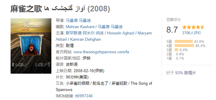 《麻雀之歌》是由伊朗被称为“亚洲斯皮伯格”的导演马基德·马基迪所执导,默罕默德·阿米尔·纳吉主演的一部剧情类型的电影。该片于2008年10月1日在伊朗上映。2008年,在第58届柏林国际电影节中,饰演本片男主人公的默罕默德·阿米尔·纳吉凭借该片获得了银熊奖最佳男演员奖,导演马基德·马基迪凭借该片获得了金熊奖的奖项提名。这是一部小众优秀影片,豆瓣上标记看过人数不足5000人,综合评估好于93%的剧情片,豆瓣分8.7分