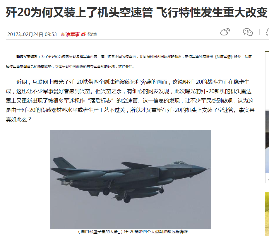 不过最终在歼二十定型并且于2017年9月19日正式公布其服役消息时,央视报道中出现的歼二十并没有空速管。