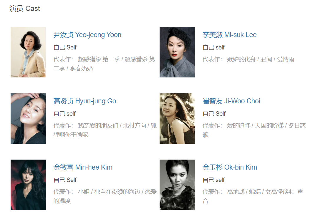 另一个过气演员李美淑的状态也不是很放松,虽然还没迈入老年,但已经是自己开车开,没有经纪人了,而人气下滑的她也非常易怒和敏感,总怀疑自己是不是别人的替补。