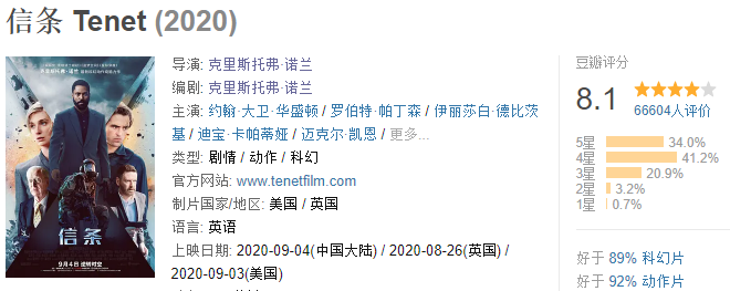 当然,豆瓣8.2、淘票票8.8的分数放在大多数导演身上已经足够优秀,可对于诺兰来说,就是不及格。