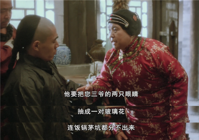 但是老板娘是个社会人,典型的天津刁妇,用银子打点死崔,稍稍用一点激将,玻璃花就暴怒着出去找傻二报仇了。天津人的嘴毒出名,老板娘随口就说出“说傻二要把玻璃花(三爷)的两只眼睛抽成一对玻璃花,连饭锅茅坑都分不出来。”