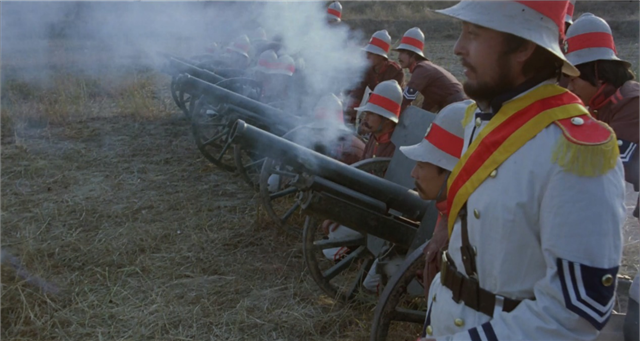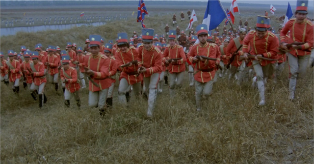 然后就到了义和团和洋人的决战之日。八国联军军容整齐,义和团杂乱随意,甚至还有一群迷信的吹鼓手。
