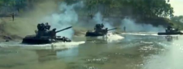 图为我军坦克正在强渡江河水障