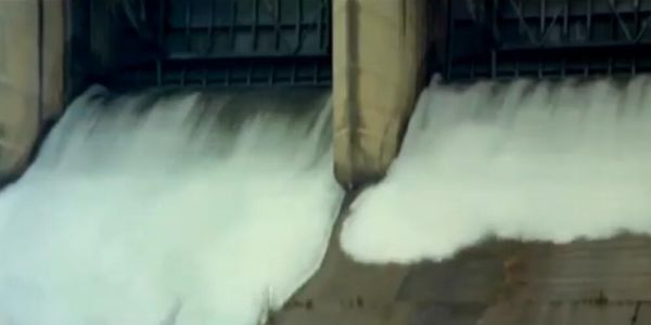 图为敌军企图开闸放水,制造水障阻挡我军前进