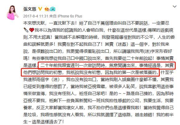 张文慈曾经自己把这件事曝了出来,轰动了香港娱乐圈,当时被称为“亚视四大花旦”的她也因此被公司雪藏。事业上深受打击,她又想到了跳楼自杀,但是家人的关爱又唤醒了她。她曾说过:“这件事上面我最感激家人,他们由头到尾都没有看不起我。”