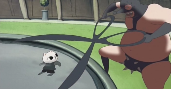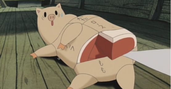于是猫弟把猪太郎暴打了一顿还从猪太郎的身上取下来了一块肉,做成了炸猪排非给姐姐吃,而一旁的猪太郎看见自己的肉则开始流口水,于是猫弟分给了他一块,猪太郎吃得很感激。