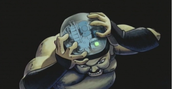 中年人在锅中挣扎,猫弟弟扯掉了中年人的头皮,发现中年人的大脑是机器,趁中年人呆滞时,猫弟抢过了剪刀杀死了中年人。
