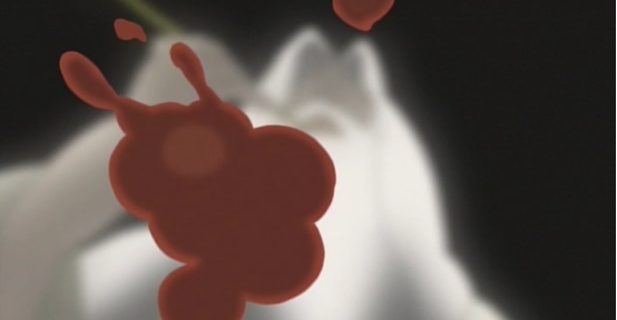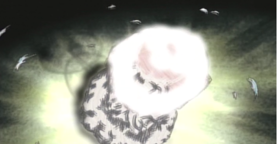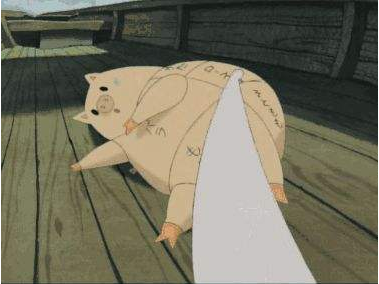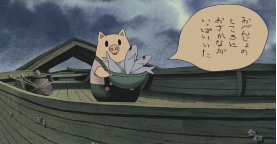 一大块肉本来是从猪太郎身上取下来的,而加工后猫姐弟拿走了大部分而设施给猪太郎的一块却赢得了猪太郎的感谢,跳出来的鱼被武士一片一片的切走自己的肉,只剩白骨了依然还在水中游荡,最后被冲上岸眼球也被夺走了。