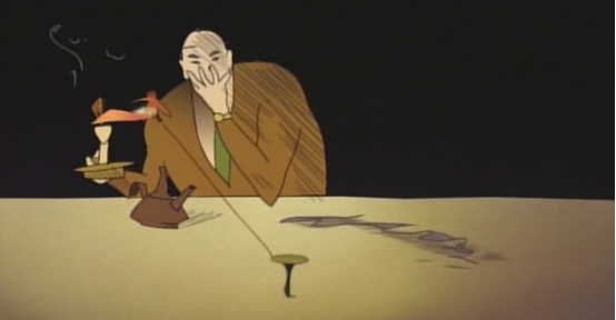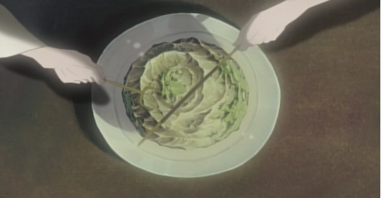 马戏团的白袍魔术师在餐盘上切割着一个星球,已经不难看出这个白发苍苍的老头便是上帝,星球被切两半后,一半滚下了餐桌,卡住了下面的时间机器,一切都停滞了。