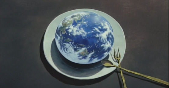 画面回到了上帝的餐桌上,这次餐盘上摆着的是地球。