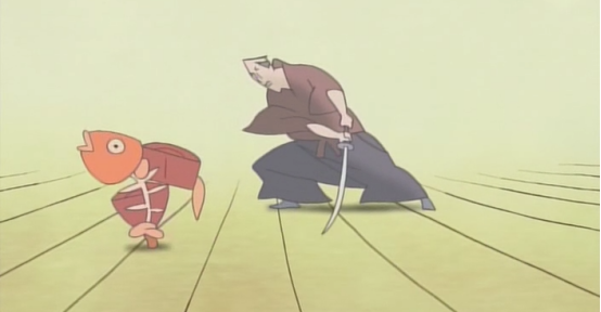 一旁桶中的鱼跳出,一群武士一刀一刀的把鱼身上的肉切了下来,最后只剩骨架的鱼跳进了水中。
