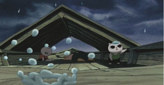 猫弟听见了雨点打在船板上的声音,露出头一看,正在下着脑袋般大的雨滴。
