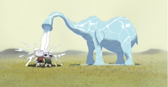 逃出宅子的姐弟俩因为走在沙漠上口渴难耐,猫弟弟发现了一个泉眼正当要喝的时候泉水冒了出来变成了水象,水象给了姐弟俩解渴的水,猫弟弟也开始和水象玩耍。