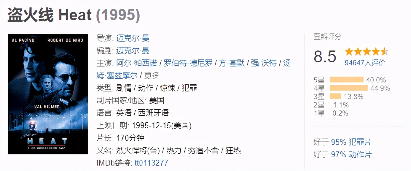 不断强调警匪针锋相对的双雄设置,很像经典犯罪电影《盗火线》,作为警匪片的标杆经常被借鉴和效仿。《除暴》也有几分《盗火线》的味道,但导演对王千源和吴彦祖的把控远没有迈克尔·曼对阿尔·帕西诺和罗伯特·德尼罗的人物塑造好。