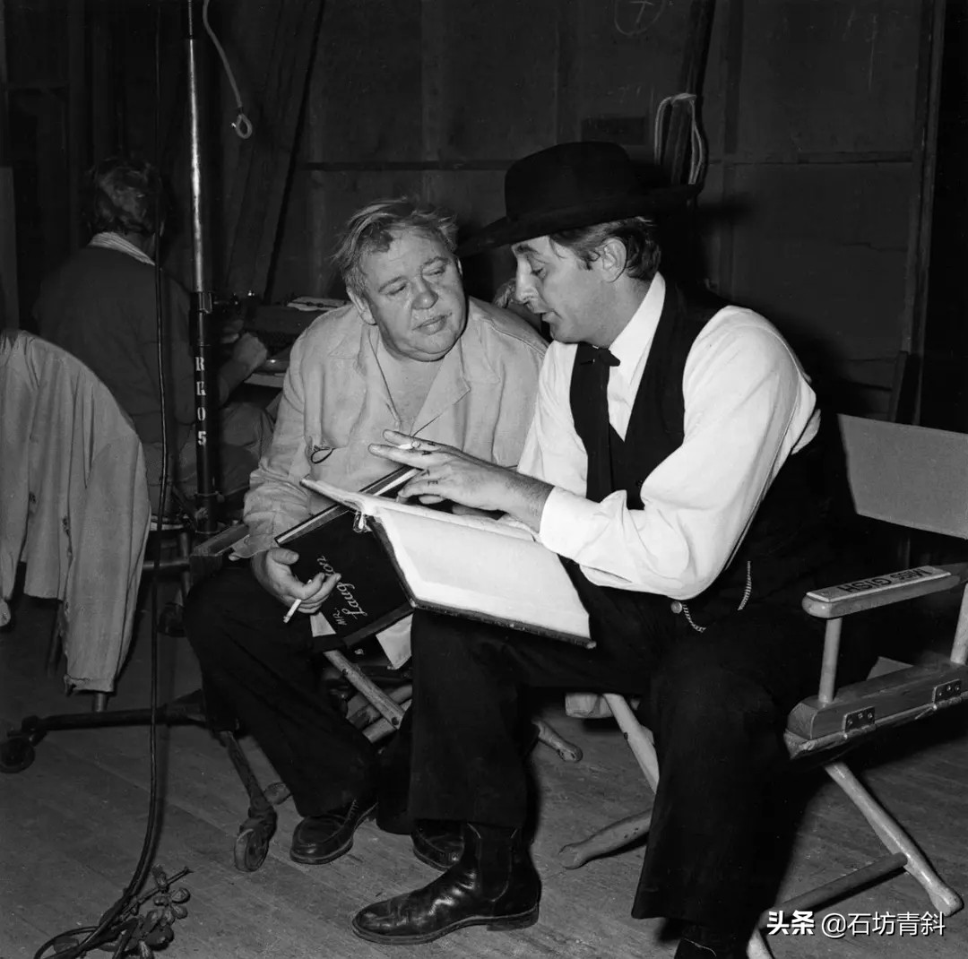 电影《猎人之夜/雾夜惊魂the night of the hunter》(1955)的片场里,导演查尔斯·劳顿charles laughton(左)和男主演罗伯特·米彻姆robert mitchum(右)讨论剧情