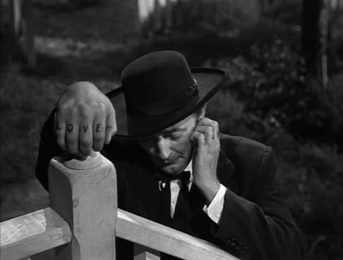 罗伯特·米彻姆(1917-1997)饰演的人物神父本·哈勃在自己的左右手上分别刺上“恨”和“爱”,自诩为上帝在世间的执行人,冷酷无情地杀人,并宣称其一切行为皆是遵从上帝的旨意。我们或许可以由其自述而得出一个明了的结论:他是一个单纯的狂热的宗教极端分子,罪恶来自内心,或者说,这是一种原罪。只是倘若影片仅止于此,那就很难有在探讨下去的必要了,因为在罪恶,或是暴力,被简单的归为一种天性时,衡量人生的价值就成为了空谈。