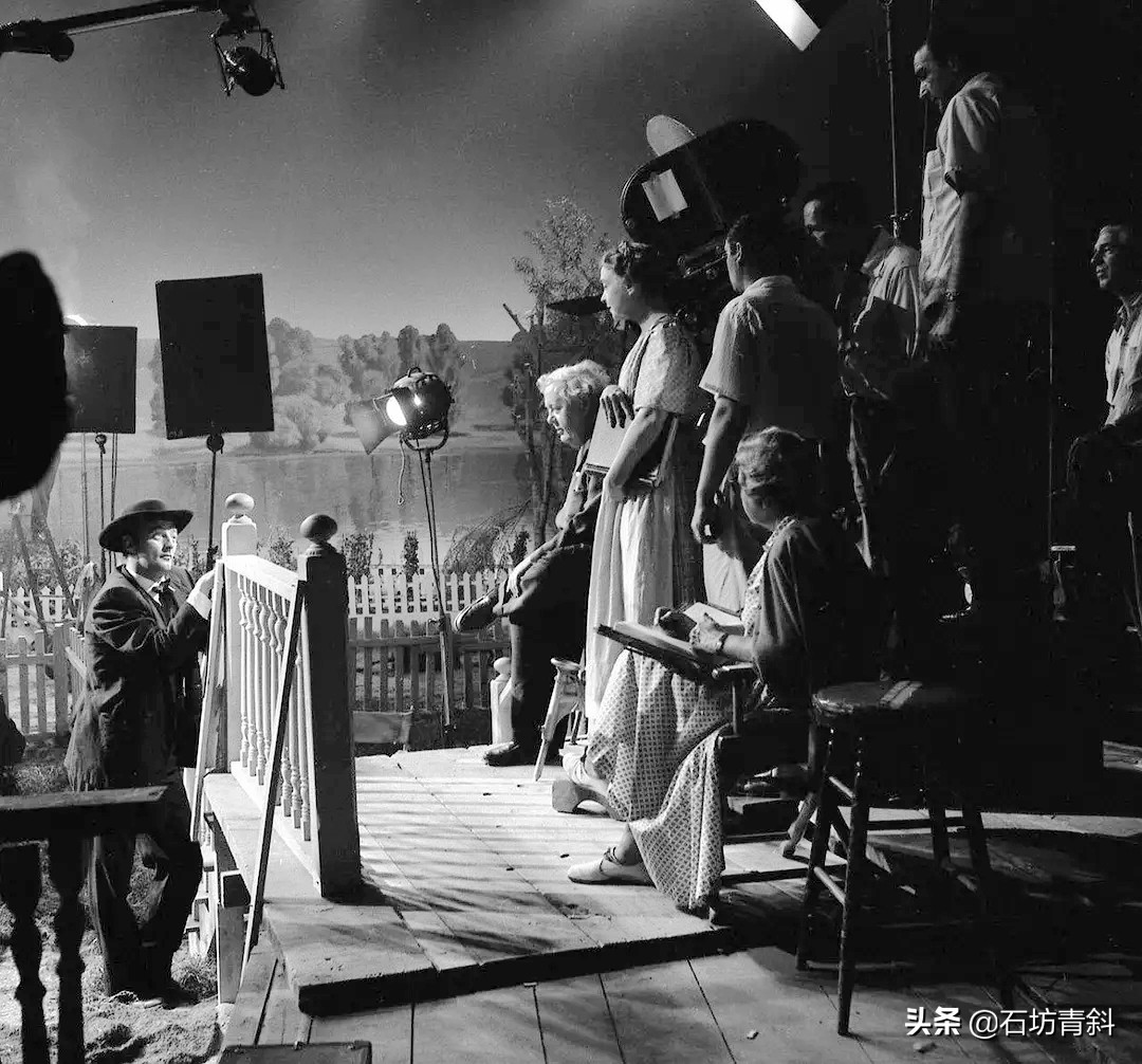 电影《猎人之夜/雾夜惊魂the night of the hunter》(1955)的片场里,导演查尔斯·劳顿charles laughton(左二坐者)指导男主演罗伯特·米彻姆robert mitchum(左一)的表演,莉莲·吉许lillian gish(左三站立者)帮着提词