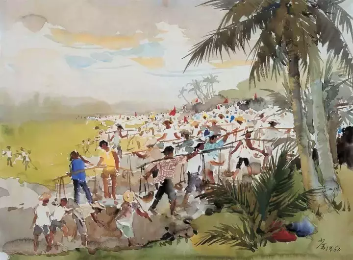 我长期写生水田。有一次从水田中观望四周田埂线的组织,很入画。我脱掉鞋站在水田中构思,感到站着所见不如坐下所见更稠密,但水田里无法坐下, 情急中便蹲着画,一味追求感受,顾不上久蹲之累。