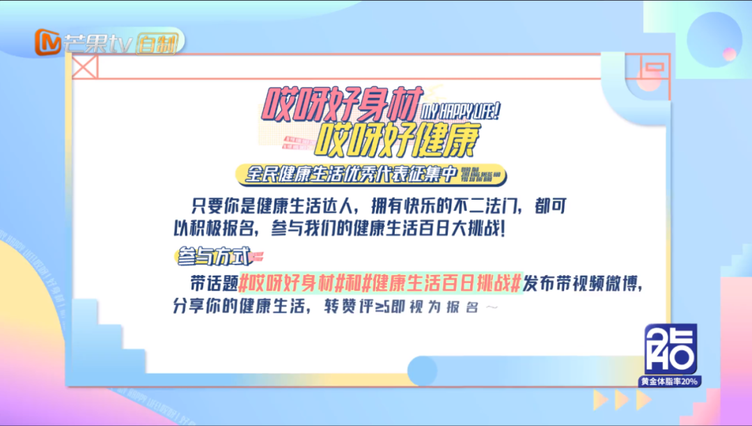 关于健康生活,需要引起重视的从来不只有嘉宾们。为了让大众共同关注健康管理,《哎呀好身材》第二季发起了健康生活百日挑战。网友在微博带#哎呀好身材# #健康生活百日挑战#双话题发布含视频微博,分享记录下的健康生活日常,即可成为全民健康生活代表。
