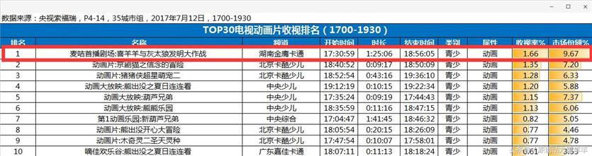 7月12日动漫收视榜榜单显示,《喜羊羊与灰太狼之发明大作战》在湖南金鹰卡通卫视开播首日,首战告捷,实力突围,取得了全国全天收视第一,收视为1.66%的优异成绩,收视遥遥领先。
