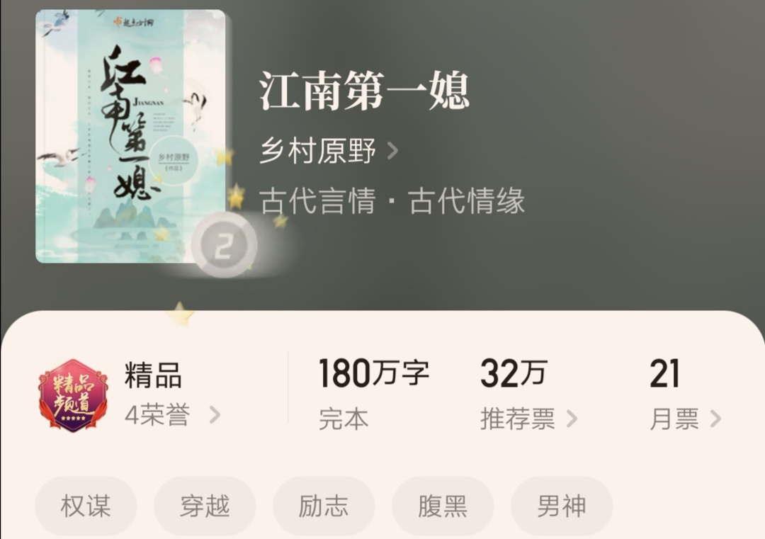 4、《江南第一媳》,作者乡村原野,全文180多万字。