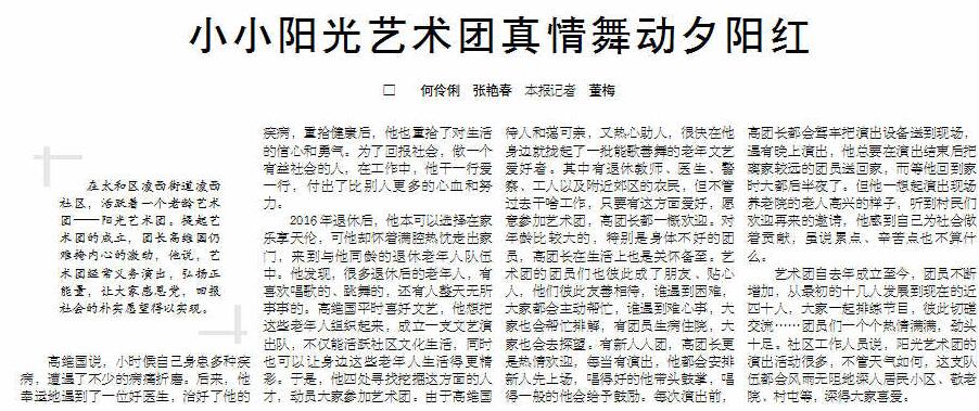 何伶俐 张艳春 本报记者 董梅 高维国说,小时候自己身患多种疾病,遭遇了不少的病痛折磨。后来,他幸运地遇到了一位好医生,治好了他的疾病,重拾健康后,他也重拾了对生活的信心和勇气。为了回报社会,做一个有益社会的人,在工作中,他干一行爱一行,付出了比别人更多的心血和努力。 2016年退休后,他本可以选择在家乐享天伦,可他却怀着满腔热忱走出家门,来到与他同龄的退休老年人队伍中。他发现,很多退休后的老年人,有喜欢唱歌的、跳舞的,还有人整天无所事事的。高维国平时喜好文艺,他想把这些老年人组织起来,成立一支文艺演出队,不仅能活跃社区文化生活,同时也可以让身边这些老年人生活得更精彩。于是,他四处寻找挖掘这方面的人才,动员大家参加艺术团。由于高维国待人和蔼可亲,又热心助人,很快在他身边就拢起了一批能歌善舞的老年文艺爱好者。其中有退休教师、医生、警察、工人以及附近郊区的农民,但不管过去干啥工作,只要有这方面爱好,愿意参加艺术团,高团长都一概欢迎。对年龄比较大的,特别是身体不好的团员,高团长在生活上也是关怀备至。艺术团的团员们也彼此成了朋友、贴心人,他们彼此友善相待,谁遇到困难,大家都会主动帮忙,谁遇到难心事,大家也会帮忙排解,有团员生病住院,大家也会去探望。有新人入团,高团长更是热情欢迎,每当有演出,他都会安排新人先上场,唱得好的他带头鼓掌,唱得一般的他会给予鼓励。每次演出前,高团长都会驾车把演出设备送到现场,遇有晚上演出,他总要在演出结束后把离家较远的团员送回家,而等他回到家时大都后半夜了。但他一想起演出现场养老院的老人高兴的样子,听到村民们欢迎再来的邀请,他感到自己为社会做着贡献,虽说累点、辛苦点也不算什么。 艺术团自去年成立至今,团员不断增加,从最初的十几人发展到现在的近四十人,大家一起排练节目,彼此切磋交流……团员们一个个热情满满,劲头十足。社区工作人员说,阳光艺术团的演出活动很多,不管天气如何,这支队伍都会风雨无阻地深入居民小区、敬老院、村屯等,深得大家喜爱。