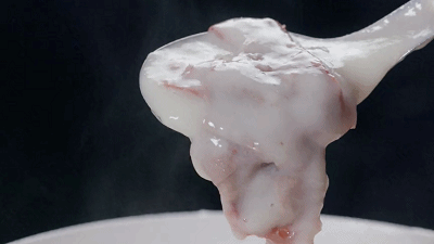 拿个小勺子拌一拌,肉片和粥难分难舍,粥的香气裹住了肉片,没有了难闻的膻味,送进嘴里一咬,肉的美味即刻在口腔里释放开。